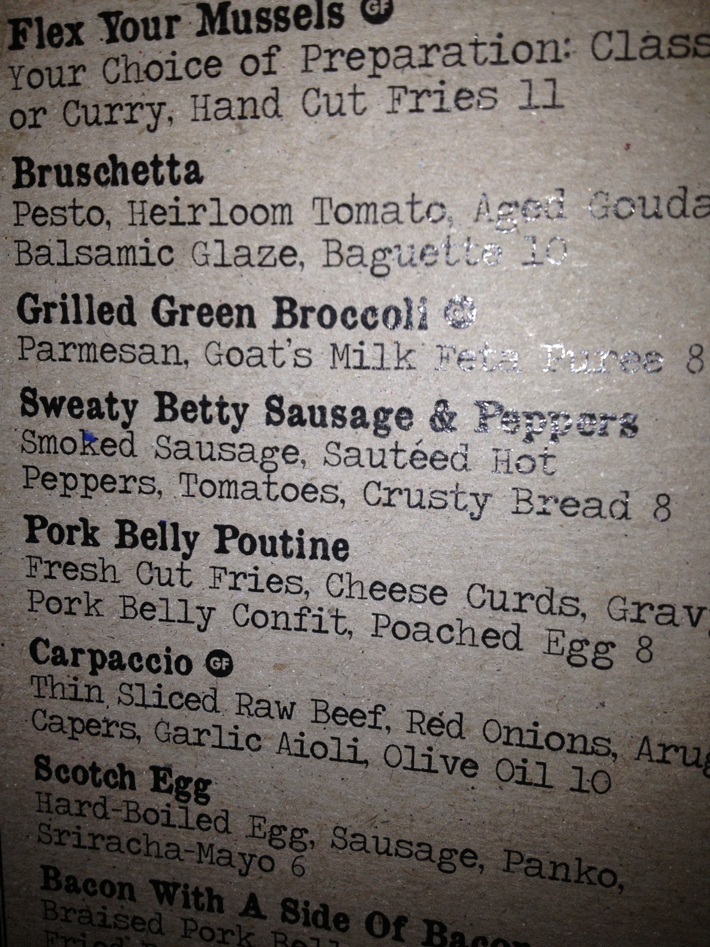 It was a Friday night around 8ish so we had to wait awhile for a table, but that was just perfect for me to get to taste MORE of their enormous beer menu (yahoo!). We sat down to friendly, helpful servers who guided our selection of two different beers and two apps (our eyes were DEFINITELY bigger than our stomachs!) it was all amazing! I’m not sure if it was the fact we were out alone for the first time in a month, the high alcohol content of the beer or the fabulous food, but I was experiencing Nirvana when the Pork Belly Poutine and the cutting board sampler came to the table.